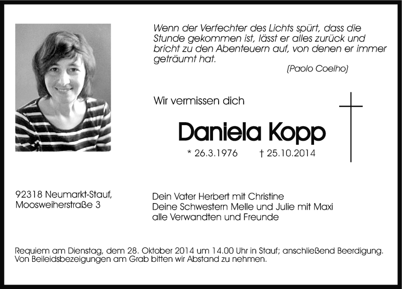 Hier finden Sie alle Traueranzeigen aus der Zeitung, die bisher für Daniela Kopp erschienen sind. Weitere Traueranzeigen, die in der Zeitung erscheinen, werden hier ebenfalls aufgelistet