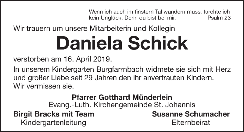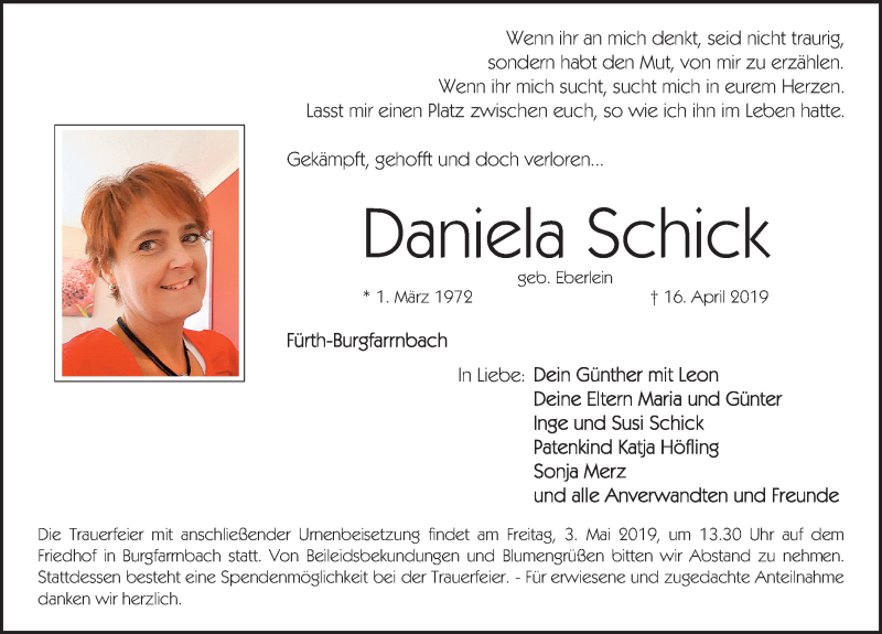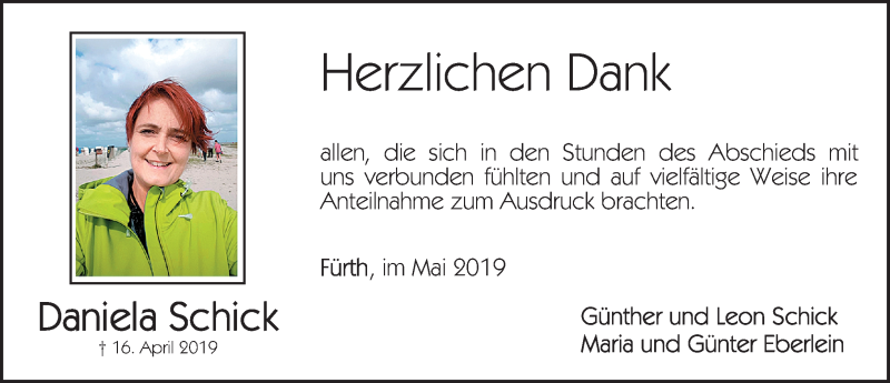 Hier finden Sie alle Traueranzeigen aus der Zeitung, die bisher für Daniela Schick erschienen sind. Weitere Traueranzeigen, die in der Zeitung erscheinen, werden hier ebenfalls aufgelistet