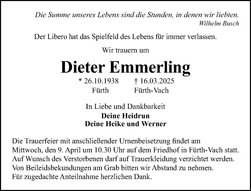 Hier finden Sie alle Traueranzeigen aus der Zeitung, die bisher für Dieter Emmerling erschienen sind. Weitere Traueranzeigen, die in der Zeitung erscheinen, werden hier ebenfalls aufgelistet