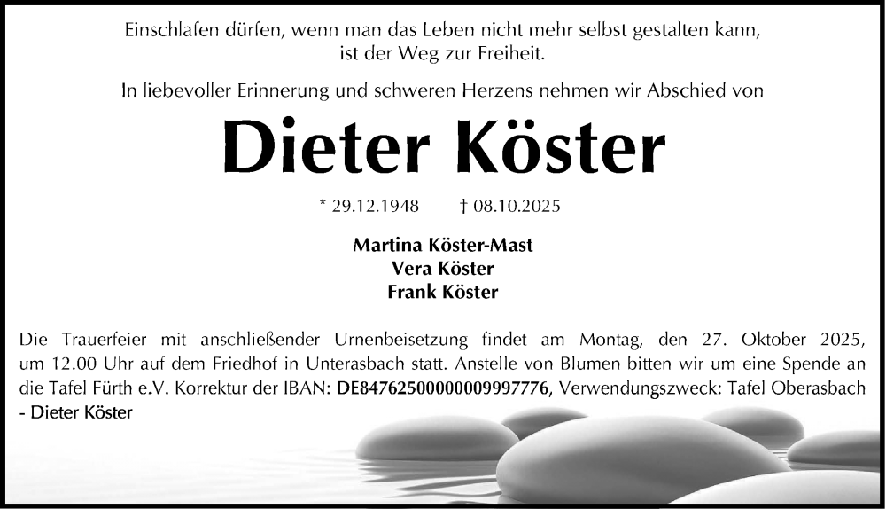 Hier finden Sie alle Traueranzeigen aus der Zeitung, die bisher für Dieter Köster erschienen sind. Weitere Traueranzeigen, die in der Zeitung erscheinen, werden hier ebenfalls aufgelistet