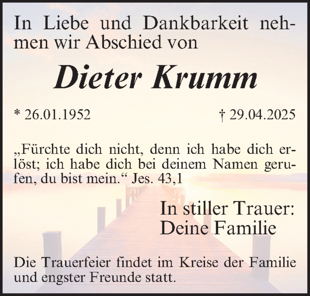 Hier finden Sie alle Traueranzeigen aus der Zeitung, die bisher für Dieter Krumm erschienen sind. Weitere Traueranzeigen, die in der Zeitung erscheinen, werden hier ebenfalls aufgelistet
