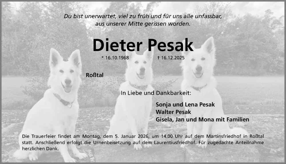 Hier finden Sie alle Traueranzeigen aus der Zeitung, die bisher für Dieter Pesak erschienen sind. Weitere Traueranzeigen, die in der Zeitung erscheinen, werden hier ebenfalls aufgelistet