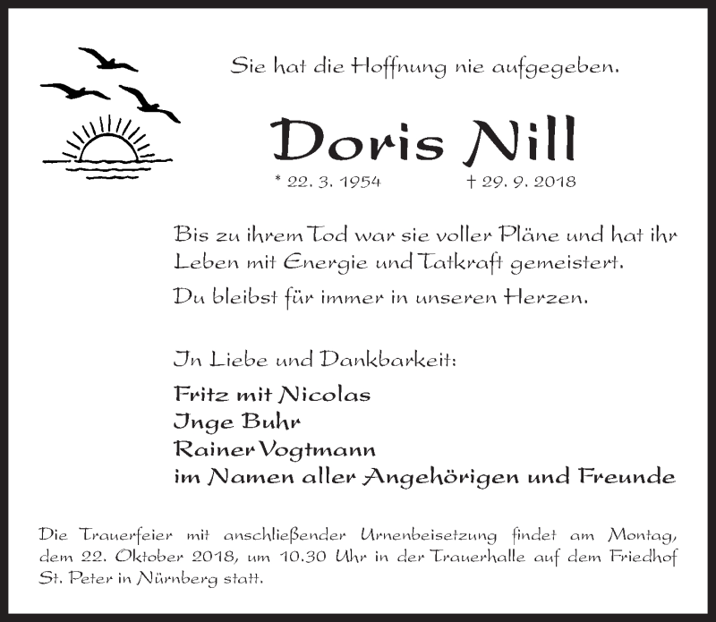 Hier finden Sie alle Traueranzeigen aus der Zeitung, die bisher für Doris Nill erschienen sind. Weitere Traueranzeigen, die in der Zeitung erscheinen, werden hier ebenfalls aufgelistet