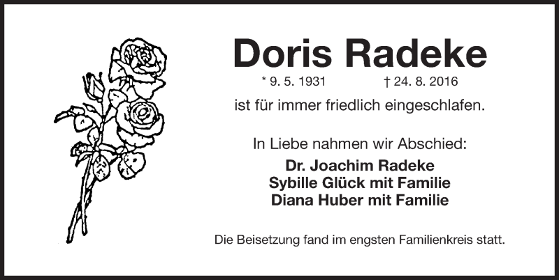 Hier finden Sie alle Traueranzeigen aus der Zeitung, die bisher für Doris Radeke erschienen sind. Weitere Traueranzeigen, die in der Zeitung erscheinen, werden hier ebenfalls aufgelistet