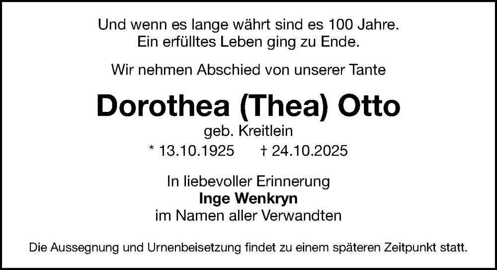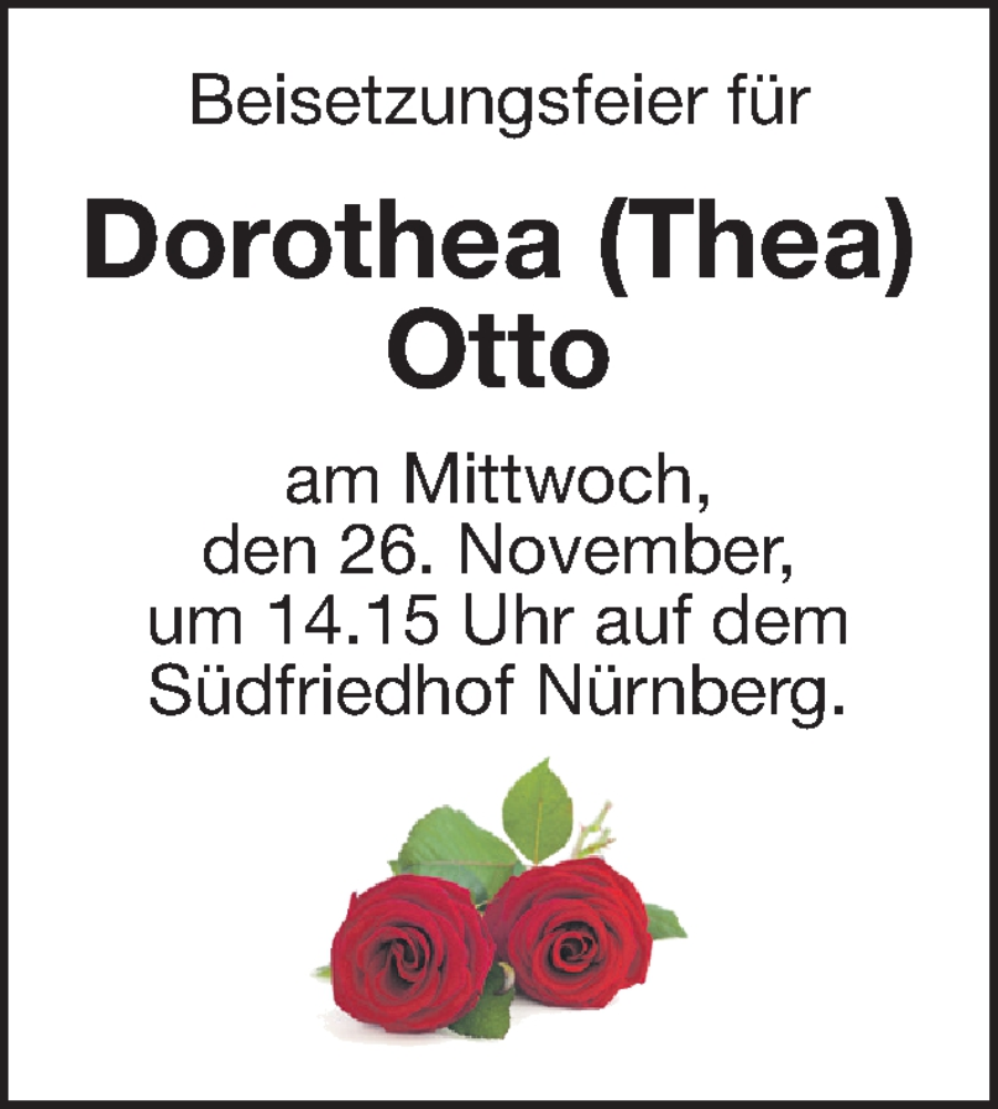 Hier finden Sie alle Traueranzeigen aus der Zeitung, die bisher für Dorothea Otto erschienen sind. Weitere Traueranzeigen, die in der Zeitung erscheinen, werden hier ebenfalls aufgelistet