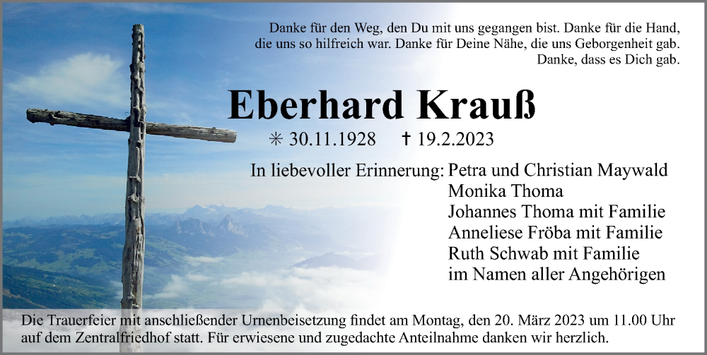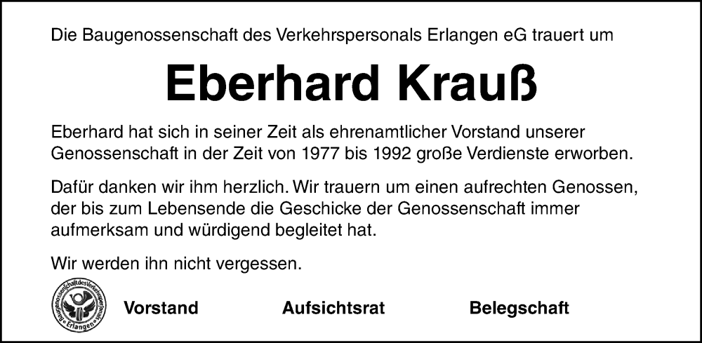 Hier finden Sie alle Traueranzeigen aus der Zeitung, die bisher für Eberhard Krauß erschienen sind. Weitere Traueranzeigen, die in der Zeitung erscheinen, werden hier ebenfalls aufgelistet