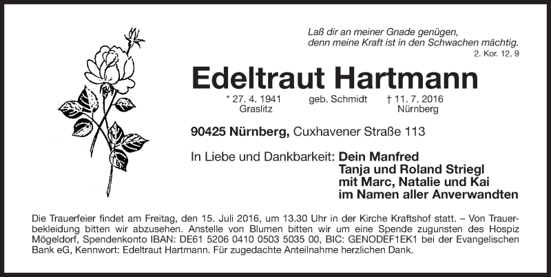 Hier finden Sie alle Traueranzeigen aus der Zeitung, die bisher für Edeltraut Hartmann erschienen sind. Weitere Traueranzeigen, die in der Zeitung erscheinen, werden hier ebenfalls aufgelistet