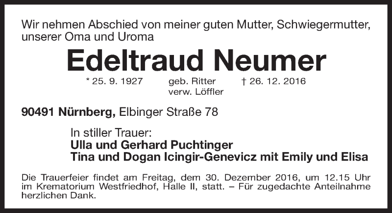 Hier finden Sie alle Traueranzeigen aus der Zeitung, die bisher für Edeltraud Neumer erschienen sind. Weitere Traueranzeigen, die in der Zeitung erscheinen, werden hier ebenfalls aufgelistet