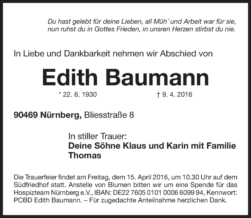 Hier finden Sie alle Traueranzeigen aus der Zeitung, die bisher für Edith Baumann erschienen sind. Weitere Traueranzeigen, die in der Zeitung erscheinen, werden hier ebenfalls aufgelistet