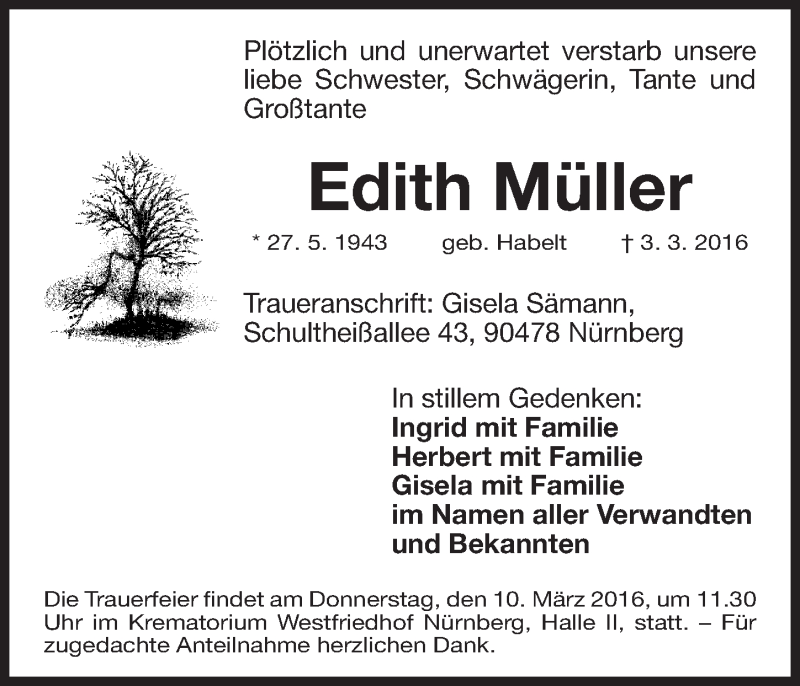 Hier finden Sie alle Traueranzeigen aus der Zeitung, die bisher für Edith Müller erschienen sind. Weitere Traueranzeigen, die in der Zeitung erscheinen, werden hier ebenfalls aufgelistet