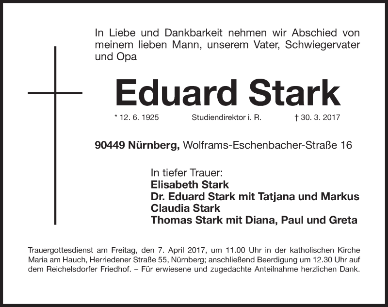 Hier finden Sie alle Traueranzeigen aus der Zeitung, die bisher für Eduard Stark erschienen sind. Weitere Traueranzeigen, die in der Zeitung erscheinen, werden hier ebenfalls aufgelistet