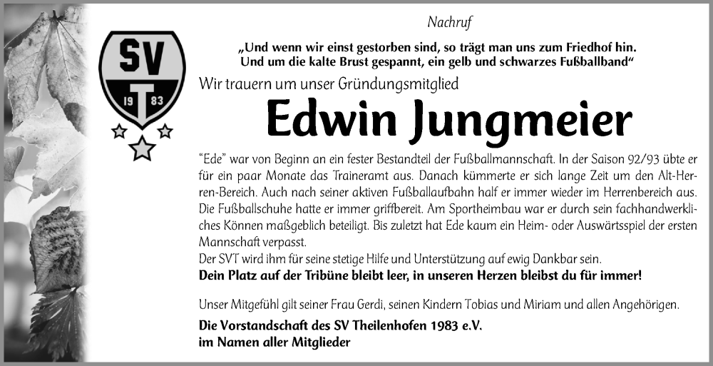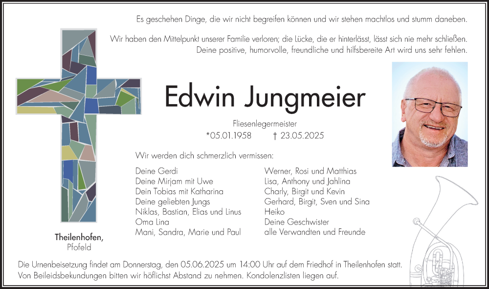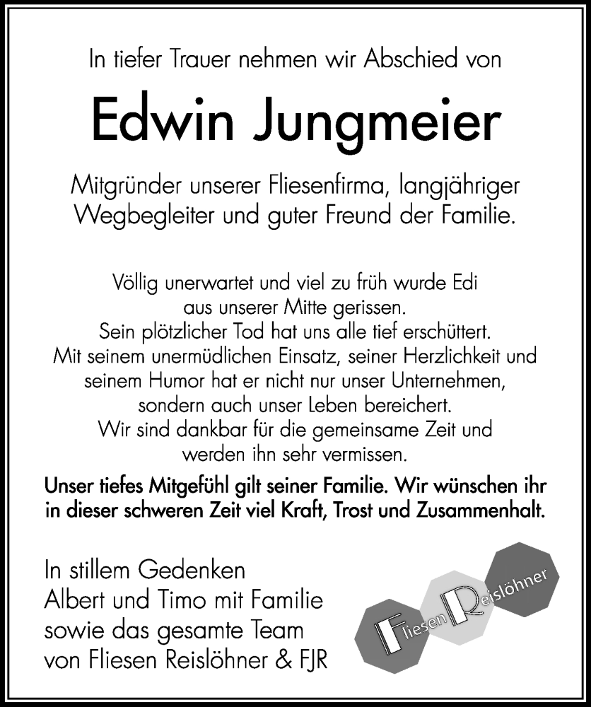 Hier finden Sie alle Traueranzeigen aus der Zeitung, die bisher für Edwin Jungmeier erschienen sind. Weitere Traueranzeigen, die in der Zeitung erscheinen, werden hier ebenfalls aufgelistet