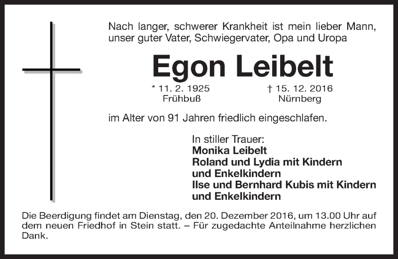 Hier finden Sie alle Traueranzeigen aus der Zeitung, die bisher für Egon Leibelt erschienen sind. Weitere Traueranzeigen, die in der Zeitung erscheinen, werden hier ebenfalls aufgelistet