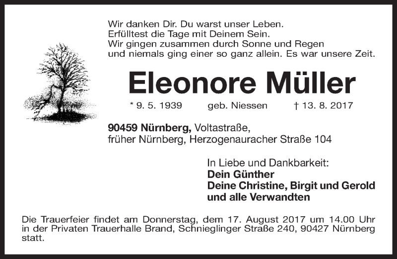 Hier finden Sie alle Traueranzeigen aus der Zeitung, die bisher für Eleonore Müller erschienen sind. Weitere Traueranzeigen, die in der Zeitung erscheinen, werden hier ebenfalls aufgelistet
