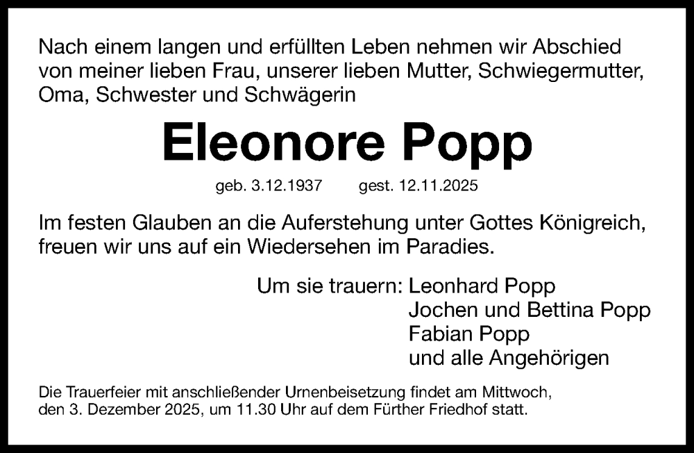 Hier finden Sie alle Traueranzeigen aus der Zeitung, die bisher für Eleonore Popp erschienen sind. Weitere Traueranzeigen, die in der Zeitung erscheinen, werden hier ebenfalls aufgelistet