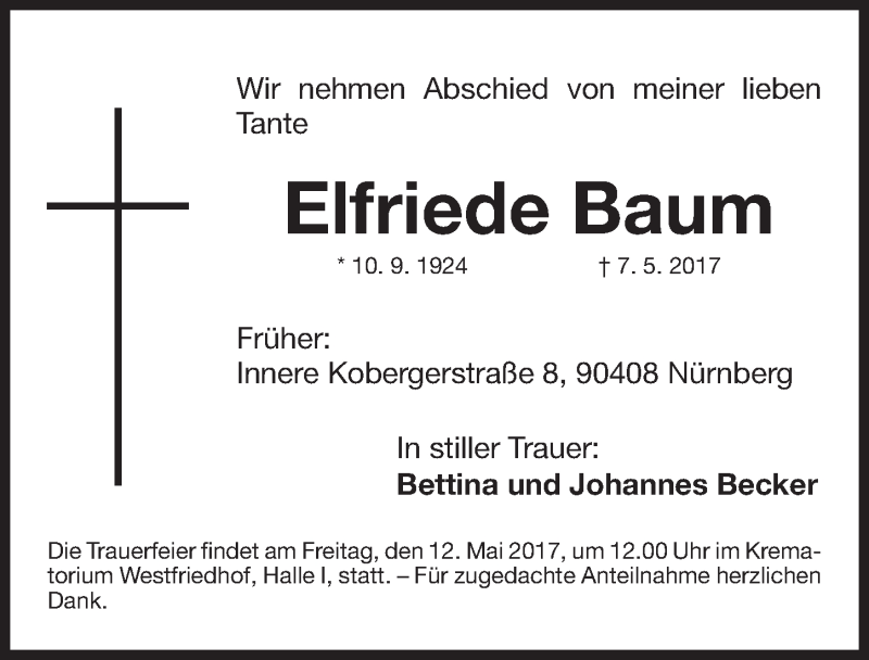 Hier finden Sie alle Traueranzeigen aus der Zeitung, die bisher für Elfriede Baum erschienen sind. Weitere Traueranzeigen, die in der Zeitung erscheinen, werden hier ebenfalls aufgelistet