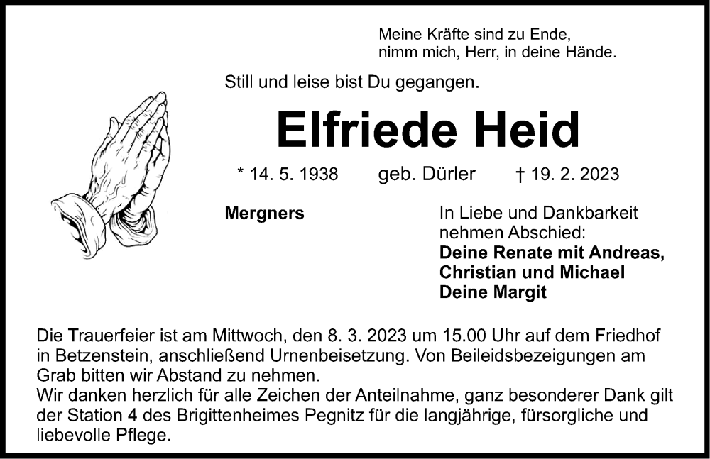 Hier finden Sie alle Traueranzeigen aus der Zeitung, die bisher für Elfriede Held erschienen sind. Weitere Traueranzeigen, die in der Zeitung erscheinen, werden hier ebenfalls aufgelistet