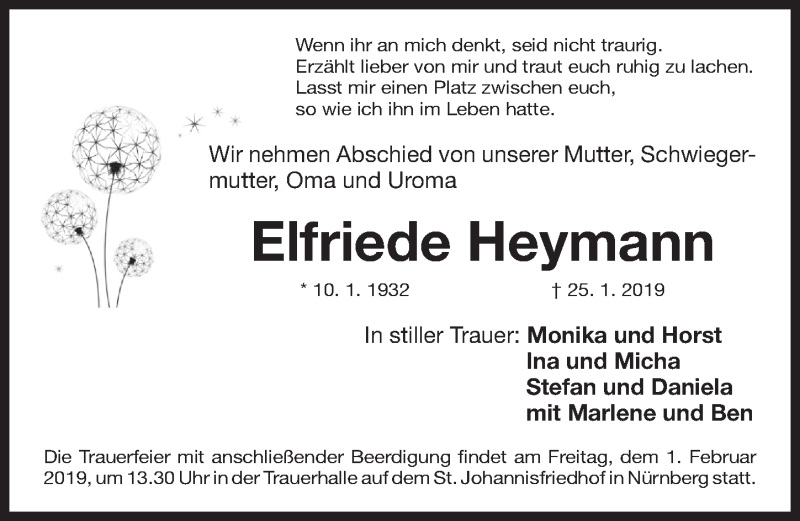 Hier finden Sie alle Traueranzeigen aus der Zeitung, die bisher für Elfriede Heymann erschienen sind. Weitere Traueranzeigen, die in der Zeitung erscheinen, werden hier ebenfalls aufgelistet