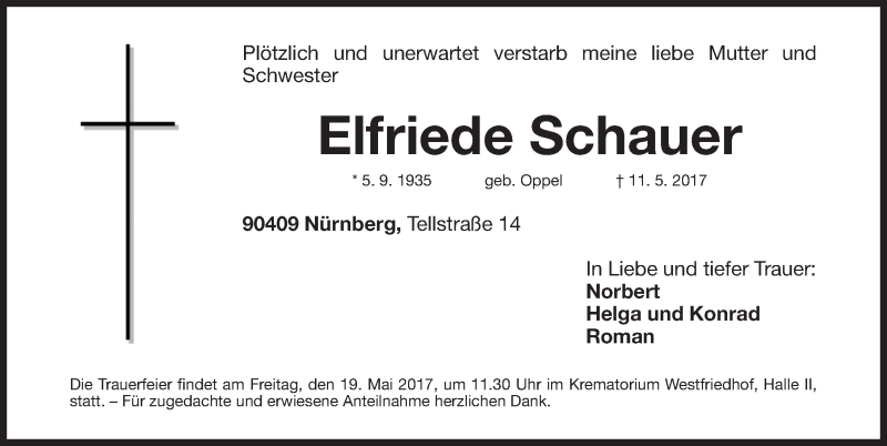 Hier finden Sie alle Traueranzeigen aus der Zeitung, die bisher für Elfriede Schauer erschienen sind. Weitere Traueranzeigen, die in der Zeitung erscheinen, werden hier ebenfalls aufgelistet