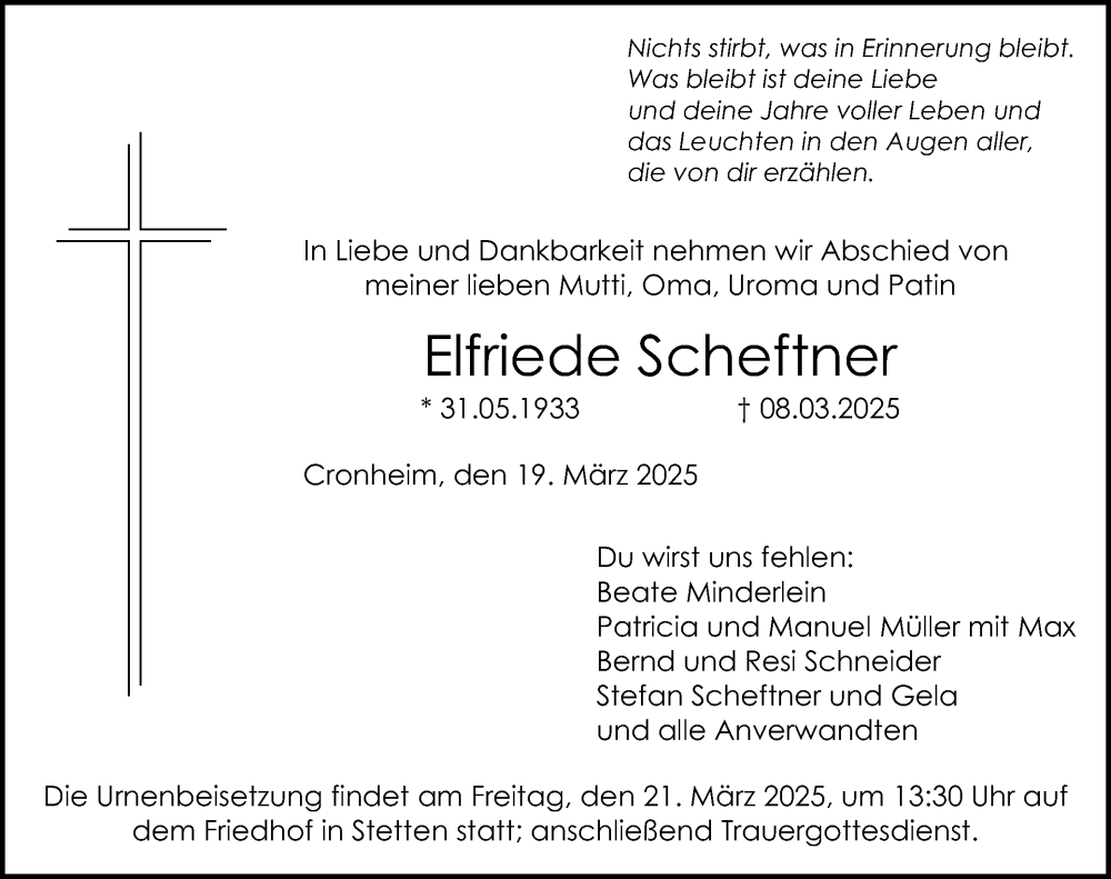 Hier finden Sie alle Traueranzeigen aus der Zeitung, die bisher für Elfriede Scheftnher erschienen sind. Weitere Traueranzeigen, die in der Zeitung erscheinen, werden hier ebenfalls aufgelistet
