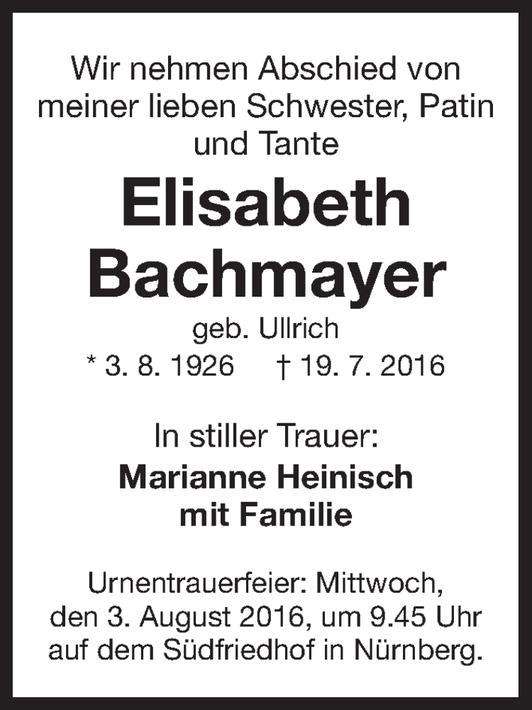 Hier finden Sie alle Traueranzeigen aus der Zeitung, die bisher für Elisabeth Bachmayer erschienen sind. Weitere Traueranzeigen, die in der Zeitung erscheinen, werden hier ebenfalls aufgelistet