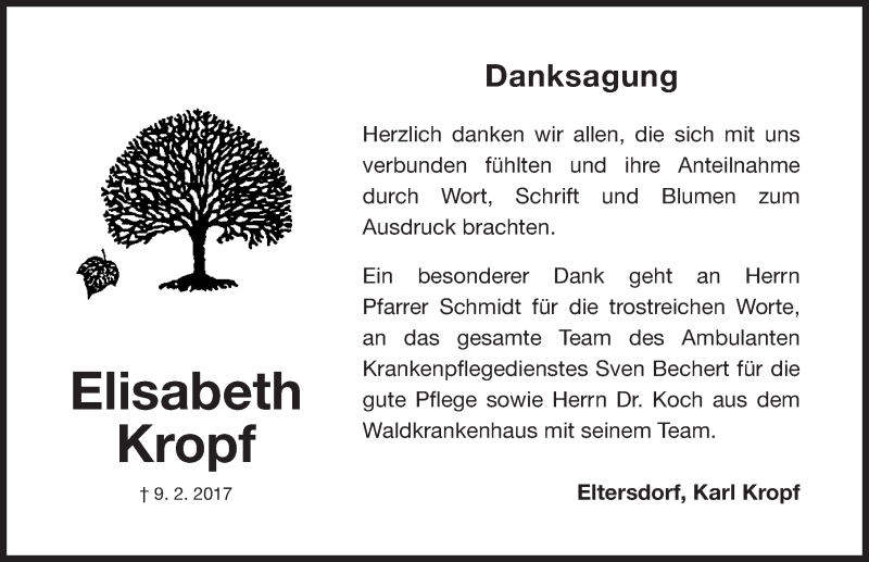 Hier finden Sie alle Traueranzeigen aus der Zeitung, die bisher für Elisabeth Kropf erschienen sind. Weitere Traueranzeigen, die in der Zeitung erscheinen, werden hier ebenfalls aufgelistet