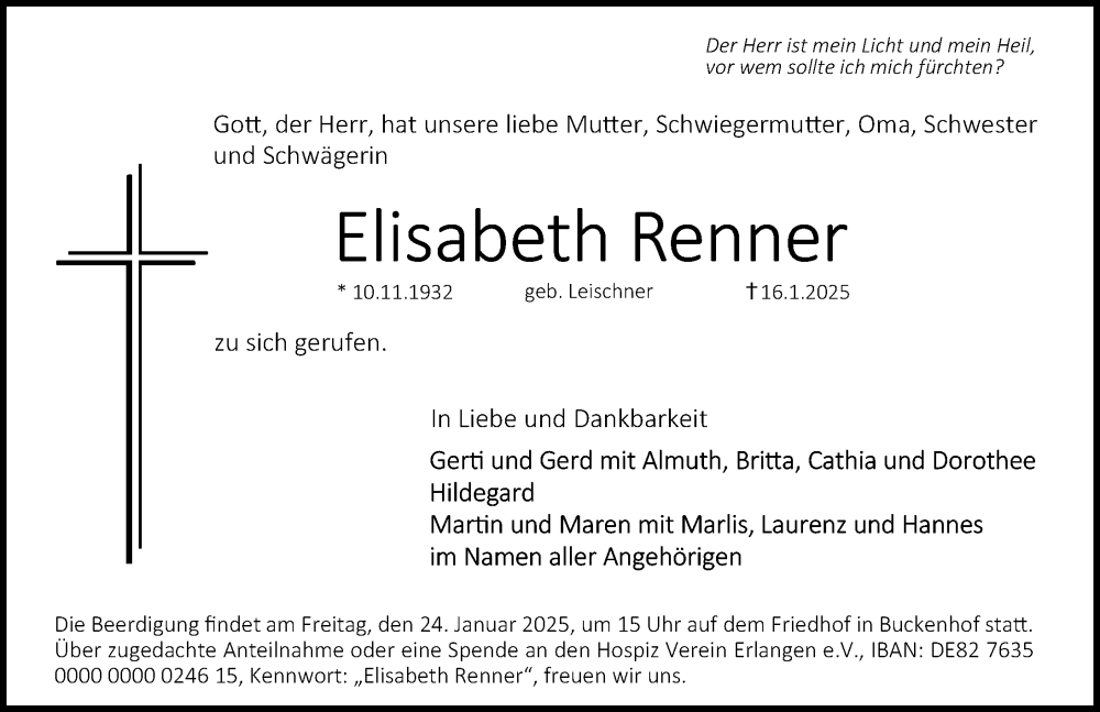 Hier finden Sie alle Traueranzeigen aus der Zeitung, die bisher für Elisabeth Renner erschienen sind. Weitere Traueranzeigen, die in der Zeitung erscheinen, werden hier ebenfalls aufgelistet