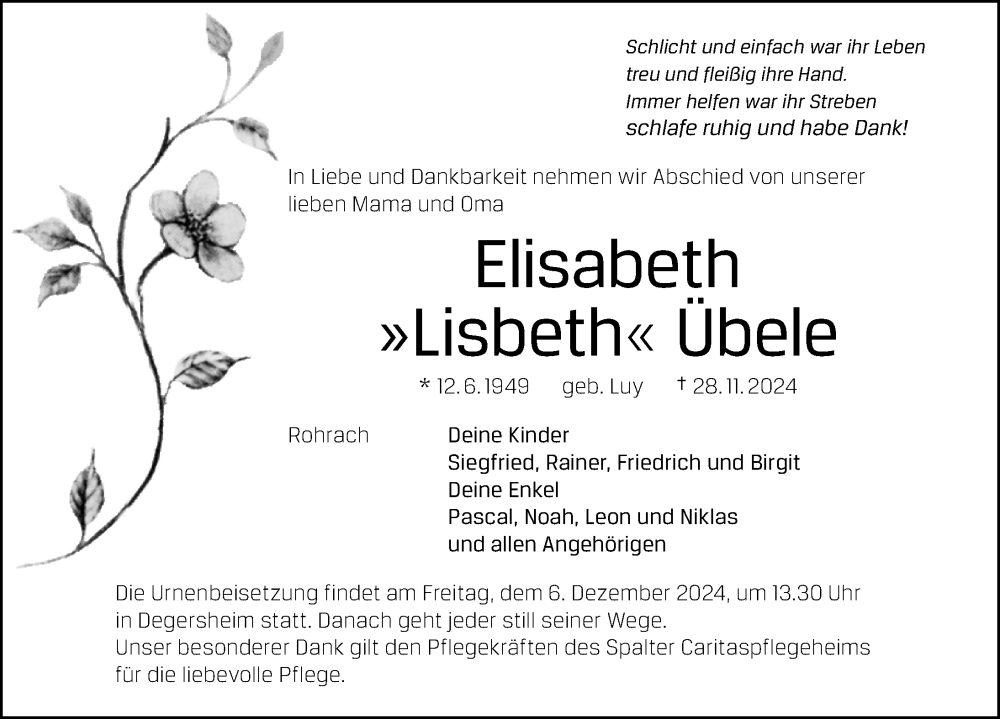 Hier finden Sie alle Traueranzeigen aus der Zeitung, die bisher für Elisabeth Übele erschienen sind. Weitere Traueranzeigen, die in der Zeitung erscheinen, werden hier ebenfalls aufgelistet
