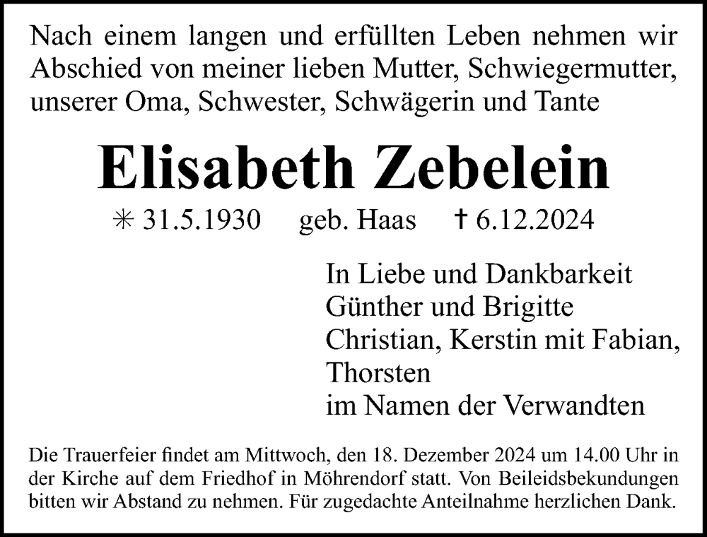 Hier finden Sie alle Traueranzeigen aus der Zeitung, die bisher für Elisabeth Zebelein erschienen sind. Weitere Traueranzeigen, die in der Zeitung erscheinen, werden hier ebenfalls aufgelistet