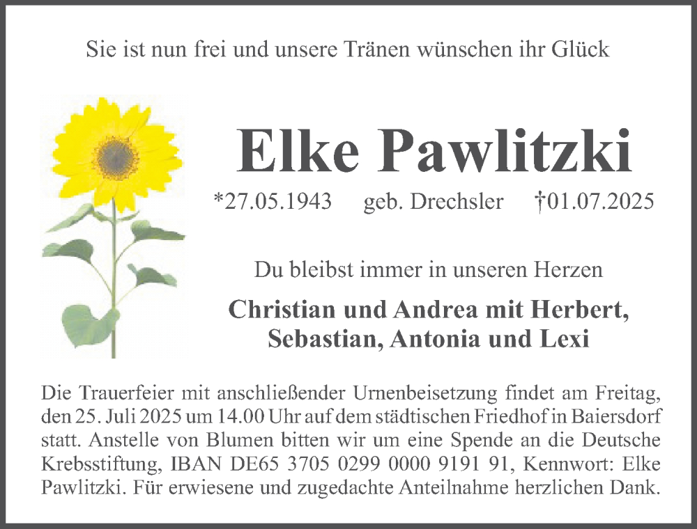 Hier finden Sie alle Traueranzeigen aus der Zeitung, die bisher für Elke Pawlitzki erschienen sind. Weitere Traueranzeigen, die in der Zeitung erscheinen, werden hier ebenfalls aufgelistet