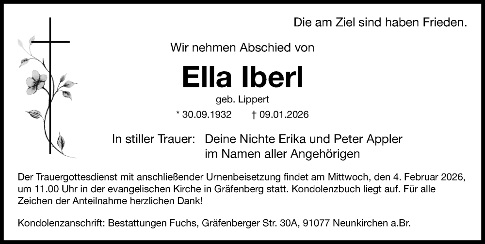 Hier finden Sie alle Traueranzeigen aus der Zeitung, die bisher für Ella Iberl erschienen sind. Weitere Traueranzeigen, die in der Zeitung erscheinen, werden hier ebenfalls aufgelistet