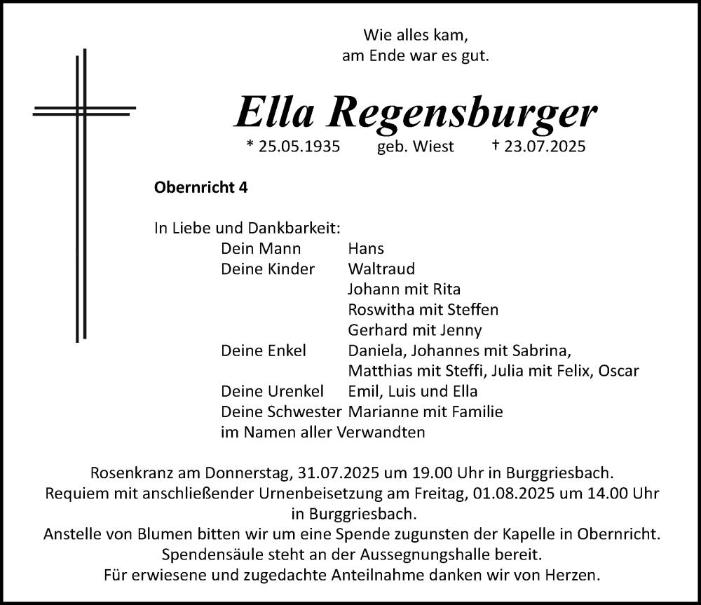 Hier finden Sie alle Traueranzeigen aus der Zeitung, die bisher für Ella Regensburger erschienen sind. Weitere Traueranzeigen, die in der Zeitung erscheinen, werden hier ebenfalls aufgelistet