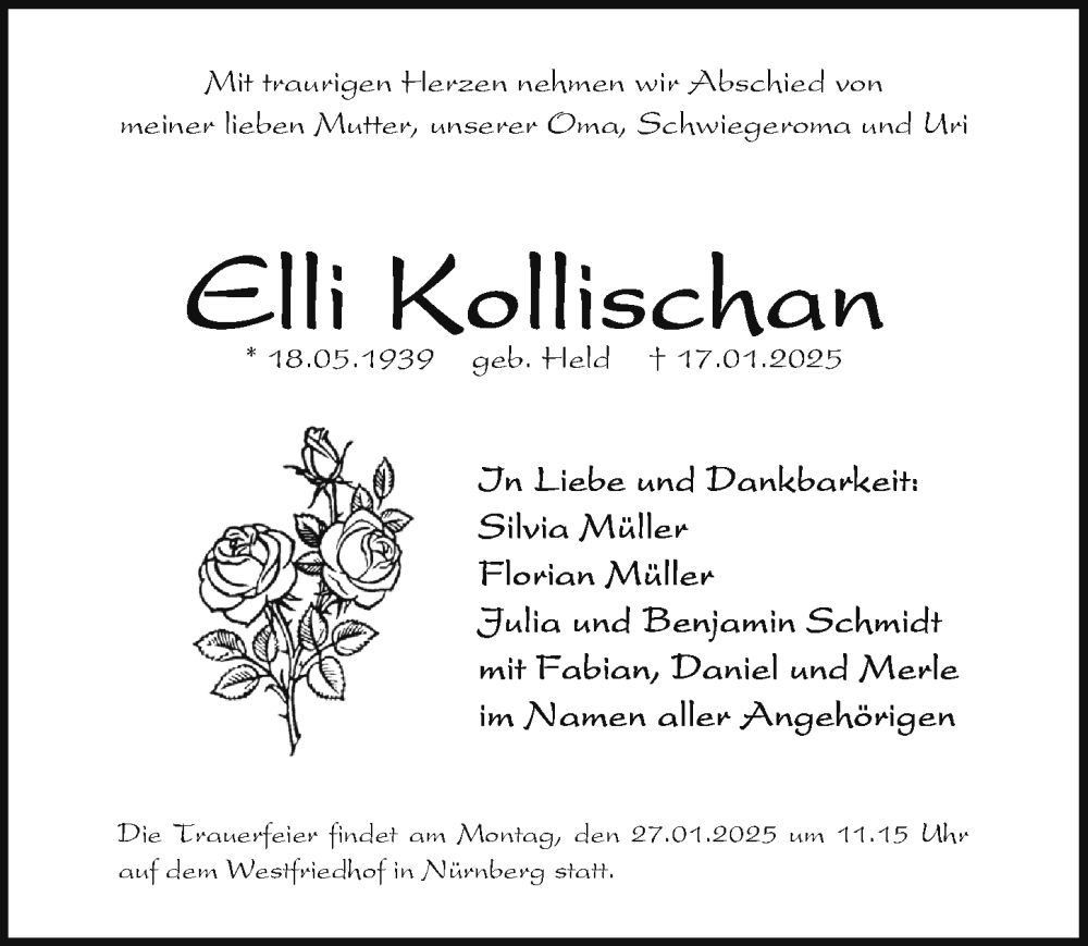 Hier finden Sie alle Traueranzeigen aus der Zeitung, die bisher für Elli Kollischan erschienen sind. Weitere Traueranzeigen, die in der Zeitung erscheinen, werden hier ebenfalls aufgelistet