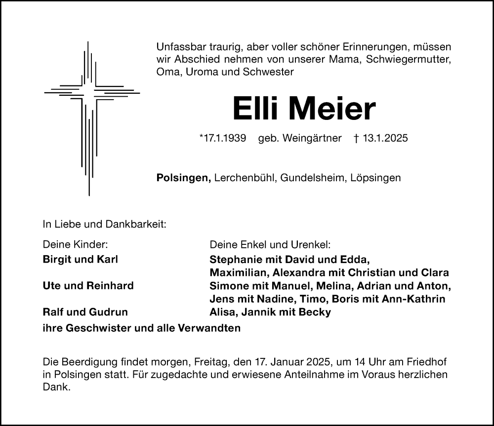 Hier finden Sie alle Traueranzeigen aus der Zeitung, die bisher für Elli Meier erschienen sind. Weitere Traueranzeigen, die in der Zeitung erscheinen, werden hier ebenfalls aufgelistet