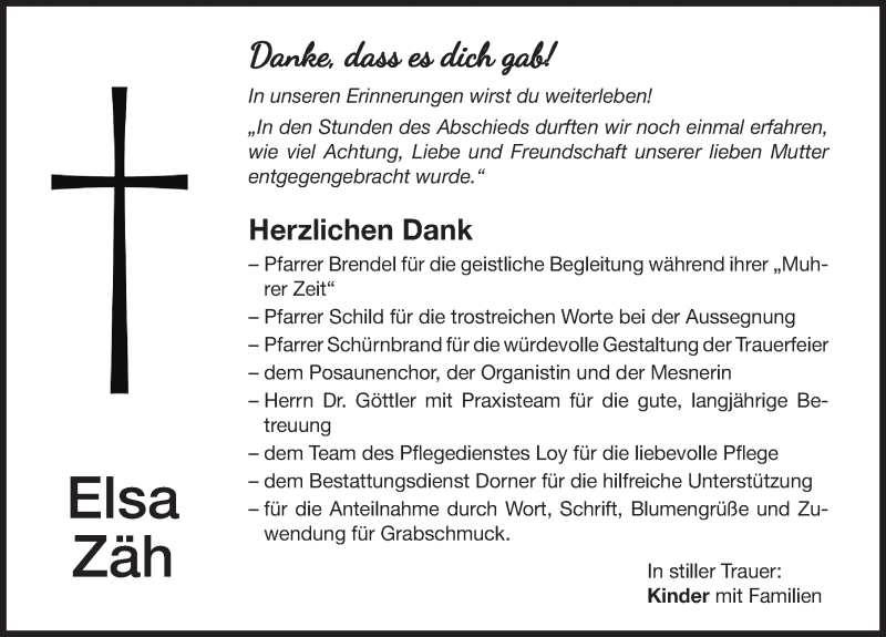Hier finden Sie alle Traueranzeigen aus der Zeitung, die bisher für Elsa Zäh erschienen sind. Weitere Traueranzeigen, die in der Zeitung erscheinen, werden hier ebenfalls aufgelistet