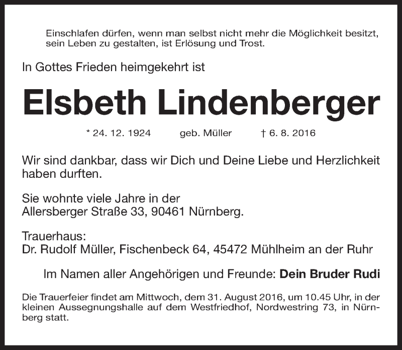 Hier finden Sie alle Traueranzeigen aus der Zeitung, die bisher für Elsbeth Lindenberger erschienen sind. Weitere Traueranzeigen, die in der Zeitung erscheinen, werden hier ebenfalls aufgelistet
