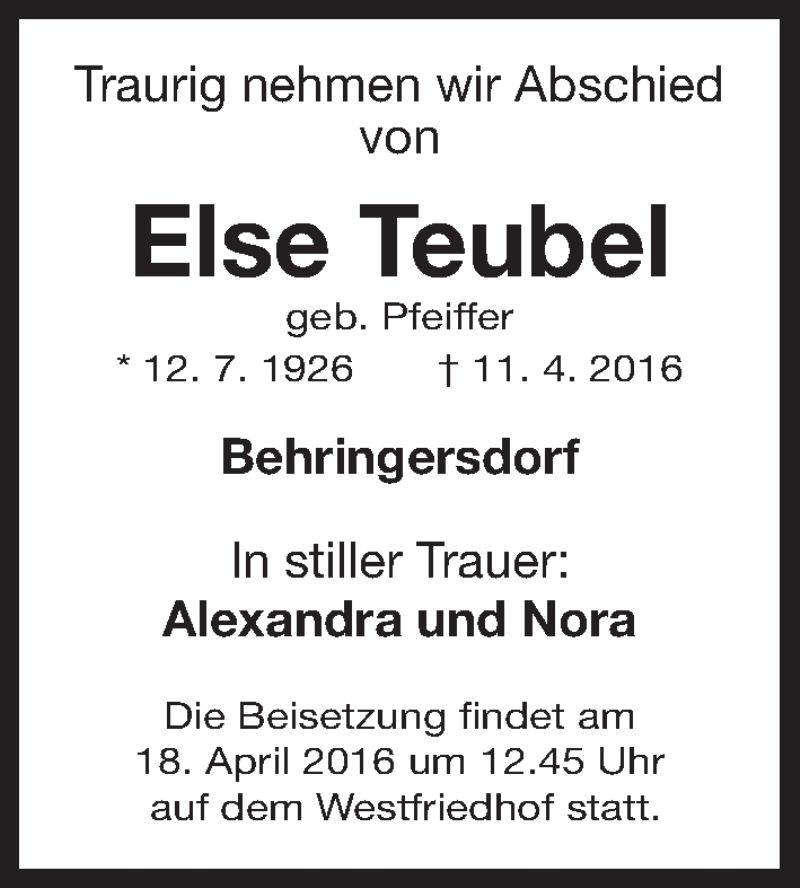 Hier finden Sie alle Traueranzeigen aus der Zeitung, die bisher für Else Teubel erschienen sind. Weitere Traueranzeigen, die in der Zeitung erscheinen, werden hier ebenfalls aufgelistet