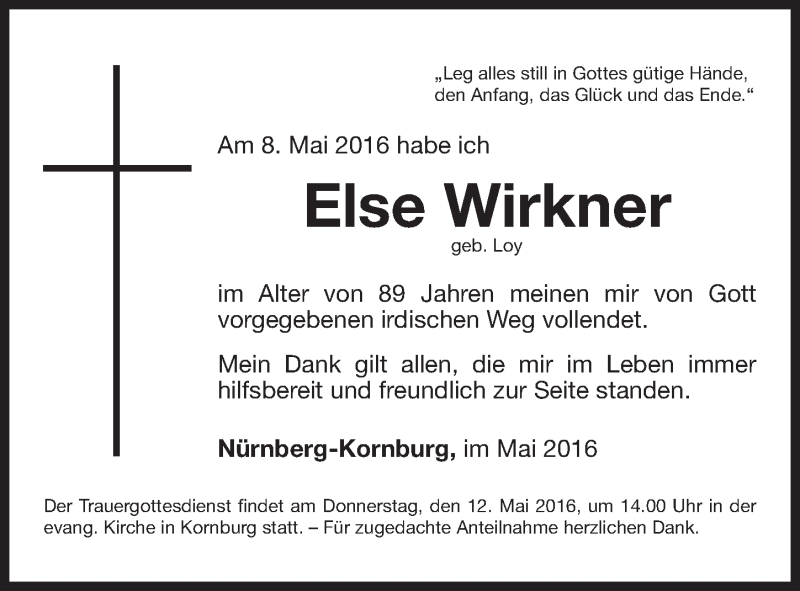 Hier finden Sie alle Traueranzeigen aus der Zeitung, die bisher für Else Wirkner erschienen sind. Weitere Traueranzeigen, die in der Zeitung erscheinen, werden hier ebenfalls aufgelistet