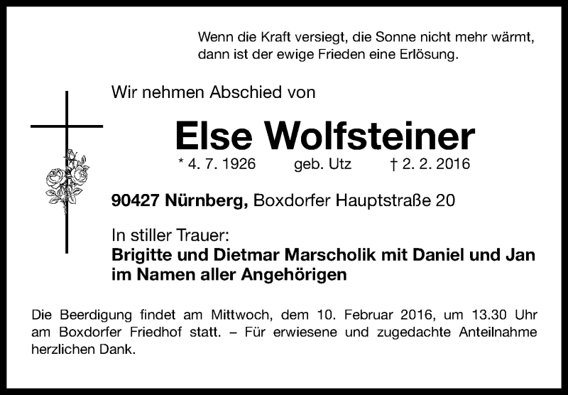 Hier finden Sie alle Traueranzeigen aus der Zeitung, die bisher für Else Wolfsteiner erschienen sind. Weitere Traueranzeigen, die in der Zeitung erscheinen, werden hier ebenfalls aufgelistet