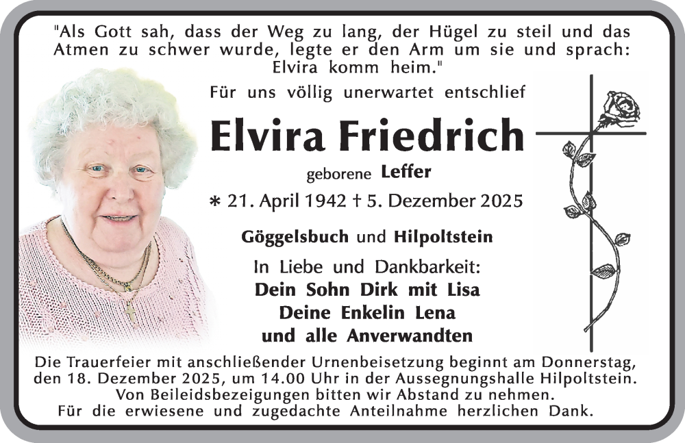 Hier finden Sie alle Traueranzeigen aus der Zeitung, die bisher für Elvira Friedrich erschienen sind. Weitere Traueranzeigen, die in der Zeitung erscheinen, werden hier ebenfalls aufgelistet