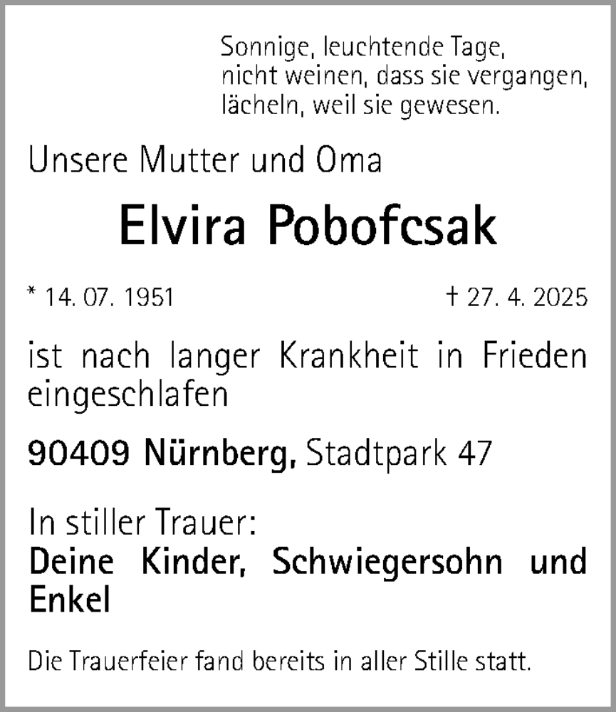 Hier finden Sie alle Traueranzeigen aus der Zeitung, die bisher für Elvira Pobofcsak erschienen sind. Weitere Traueranzeigen, die in der Zeitung erscheinen, werden hier ebenfalls aufgelistet
