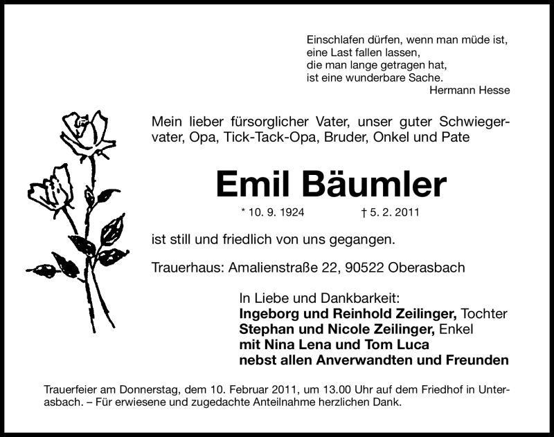 Hier finden Sie alle Traueranzeigen aus der Zeitung, die bisher für Emil Bäumler erschienen sind. Weitere Traueranzeigen, die in der Zeitung erscheinen, werden hier ebenfalls aufgelistet