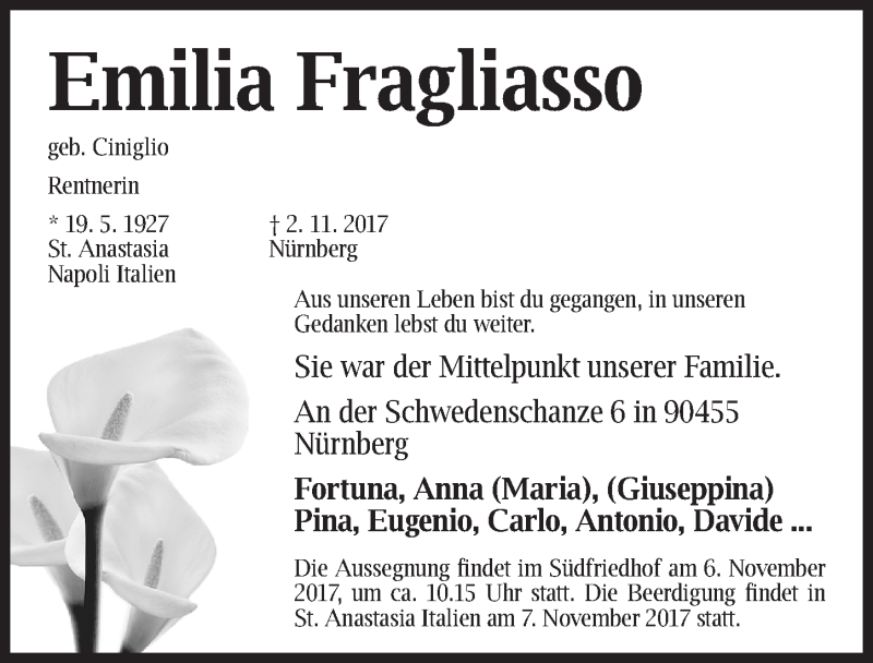 Hier finden Sie alle Traueranzeigen aus der Zeitung, die bisher für Emilia Fragliasso erschienen sind. Weitere Traueranzeigen, die in der Zeitung erscheinen, werden hier ebenfalls aufgelistet