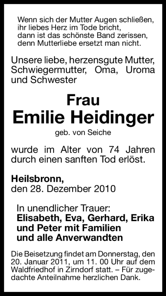 Hier finden Sie alle Traueranzeigen aus der Zeitung, die bisher für Emilie Heidinger erschienen sind. Weitere Traueranzeigen, die in der Zeitung erscheinen, werden hier ebenfalls aufgelistet