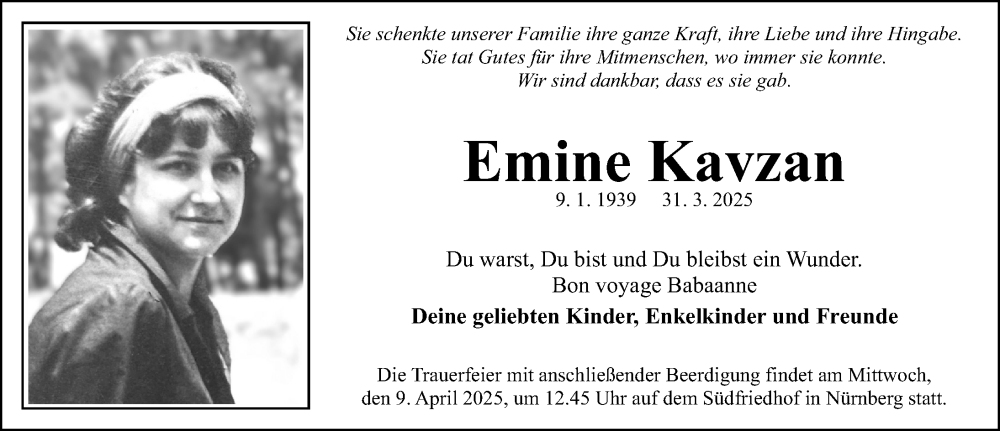 Hier finden Sie alle Traueranzeigen aus der Zeitung, die bisher für Emine Kavzan erschienen sind. Weitere Traueranzeigen, die in der Zeitung erscheinen, werden hier ebenfalls aufgelistet
