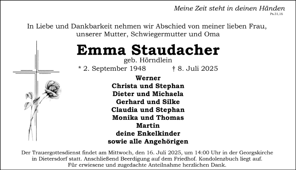 Hier finden Sie alle Traueranzeigen aus der Zeitung, die bisher für Emma Staudacher erschienen sind. Weitere Traueranzeigen, die in der Zeitung erscheinen, werden hier ebenfalls aufgelistet