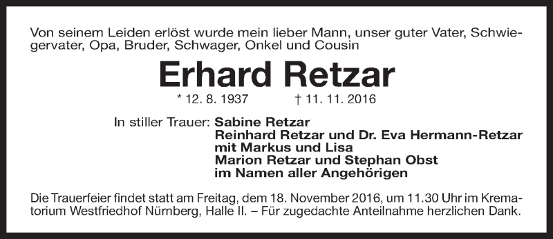 Hier finden Sie alle Traueranzeigen aus der Zeitung, die bisher für Erhard Retzar erschienen sind. Weitere Traueranzeigen, die in der Zeitung erscheinen, werden hier ebenfalls aufgelistet
