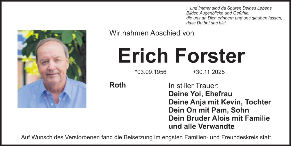 Hier finden Sie alle Traueranzeigen aus der Zeitung, die bisher für Erich Forster erschienen sind. Weitere Traueranzeigen, die in der Zeitung erscheinen, werden hier ebenfalls aufgelistet