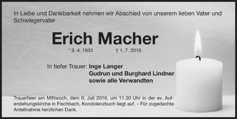 Hier finden Sie alle Traueranzeigen aus der Zeitung, die bisher für Erich Macher erschienen sind. Weitere Traueranzeigen, die in der Zeitung erscheinen, werden hier ebenfalls aufgelistet
