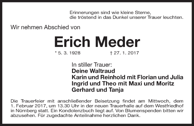 Hier finden Sie alle Traueranzeigen aus der Zeitung, die bisher für Erich Meder erschienen sind. Weitere Traueranzeigen, die in der Zeitung erscheinen, werden hier ebenfalls aufgelistet